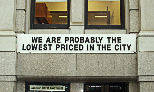 This small sign hangs above a nondescript shoe store on Trinity Street in New York City. It fills my belly with copywriter envy.